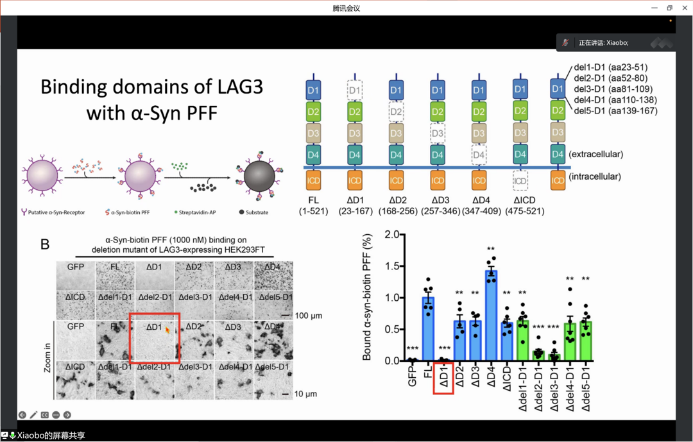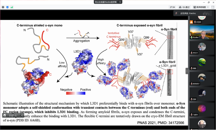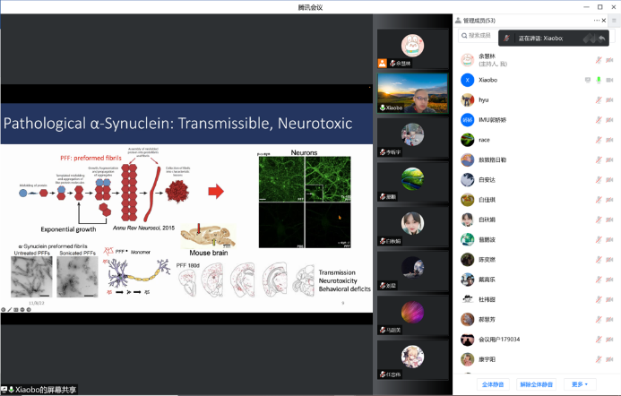 本次学术交流会上,Dr. Xiaobo Mao以《Pathogenic alpha-synuclein transmission and neurotoxicity mechanisms and related disease therapy》为题,介绍了α-突触核蛋白传递和神经毒理机制。Dr. Xiaobo Mao研究发现,磷酸化修饰能够极大地增强α-突触核蛋白纤维与受体蛋白之间的结合力,加速α-突触核蛋白病理纤维在神经元中的内吞、聚集和传播,并加重帕金森模型小鼠的相关症状。他们还发现激活PARP-1,产生PAR,可促进α-突触核蛋白纤维化,参与病理性α-突触核蛋白介导的细胞损伤,促进帕金森病的进展。