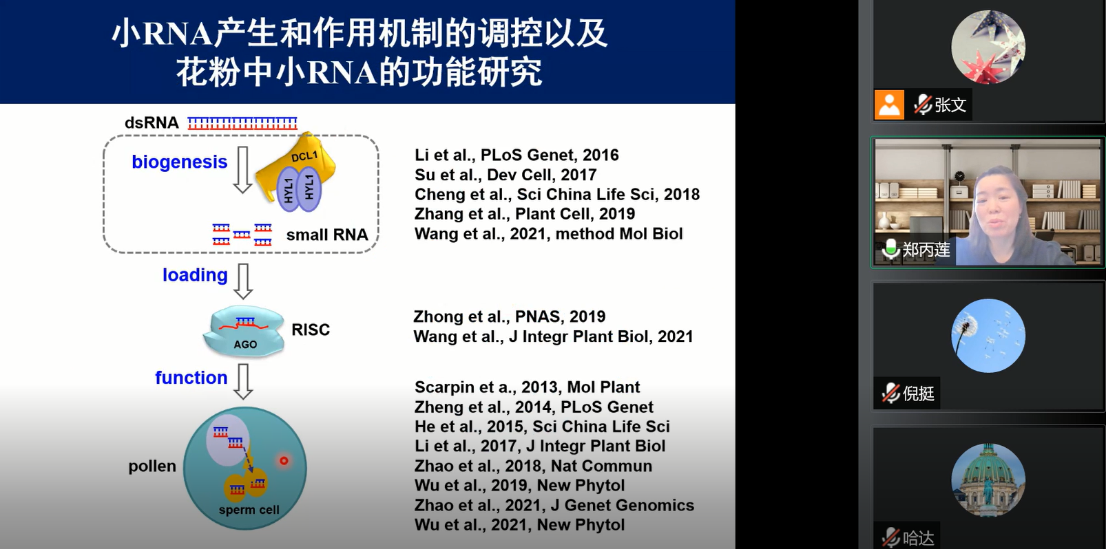 报告中,郑教授以“植物非编码RNA的产生、作用机制和功能研究”为题,对非编码RNA的发现、分类进行了详细介绍。然后,围绕小RNA产生和作用机制的调控以及花粉中小RNA的功能研究进行了本实验室相关课题的介绍,包括花粉中环状RNA的切割和代谢、筛选花粉中siRNA移动的调控因子、miR159调控种子发育等研究。