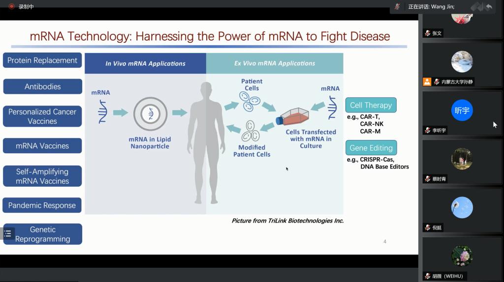 王进,太阳集团tyc138研究员,博士生导师,生物分析化学与化学生物学实验室负责人,兼任省部共建草原家畜生殖调控与繁育国家重点实验室研究员,主要研究方向包括核酸化学生物学、核酸化学修饰、质谱分析、生物分析化学,已在Nucleic Acids Research、Journal of Clinical Investigation、Nature 等国际学术期刊上发表多篇论文。王进研究员围绕‘mRNA加帽的生物学功能和应用’进行了有关mRNA的基础知识、最新进展及其近期研究工作(Wang. J. et al. Nucleic Acids Res 2019:e130.)的介绍。另外,他阐述了近年来自己所研发的mRNA加帽技术‘CapQuant’方法,该方法不仅适用于定量体内或体外来源RNA,还可用于研究多种生物过程,包括RNA代谢、特定的转录问题、揭示基因表达、以及端帽结合蛋白调控基因表达等。