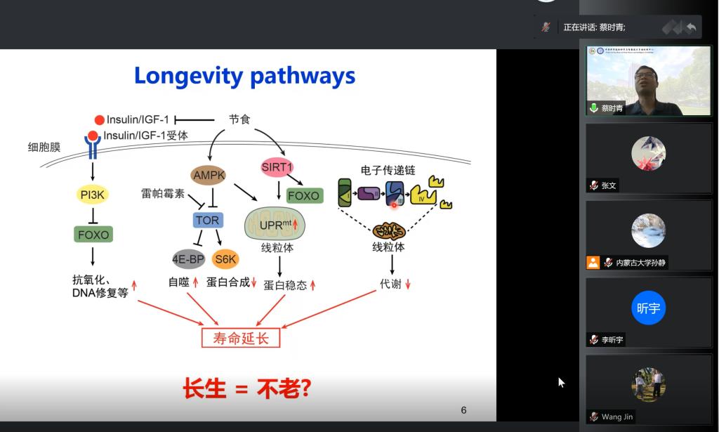 蔡时青,中国科学院上海生命科学研究院神经科学研究所高级研究员,2004至2009年曾在美国新泽西医科牙科大学做博士后工作。2009年回国担任中国科学院神经科学研究所离子通道调控研究组组长,在Nature、Molecular cell、Nature Communication等知名国际期刊发表论文数篇。在此次报告中,蔡时青研究员以‘衰老的神经生物学基础’为题,探讨延长寿命与健康老化之间的关联,以及在衰老过程中行为功能退化方面的机制研究(Yin Gao et al. Nature 2017;Yuan et al. Nature 2020)。蔡时青研究员围绕两种神经递质因子,以线虫为模式动物,从长寿基因是如何影响衰老过程的行为退化、衰老过程当中行为的调控机制、以及从群基因组水平筛选调控衰老速度的基因等三个方面进行探讨。研究发现,延长寿命并不一定能够延缓衰老过程中表型的退化。该项研究的特色在于首次在基因组水平分析衰老过程中行为退化的调控机制,为今后研究衰老提出新的研究思路。