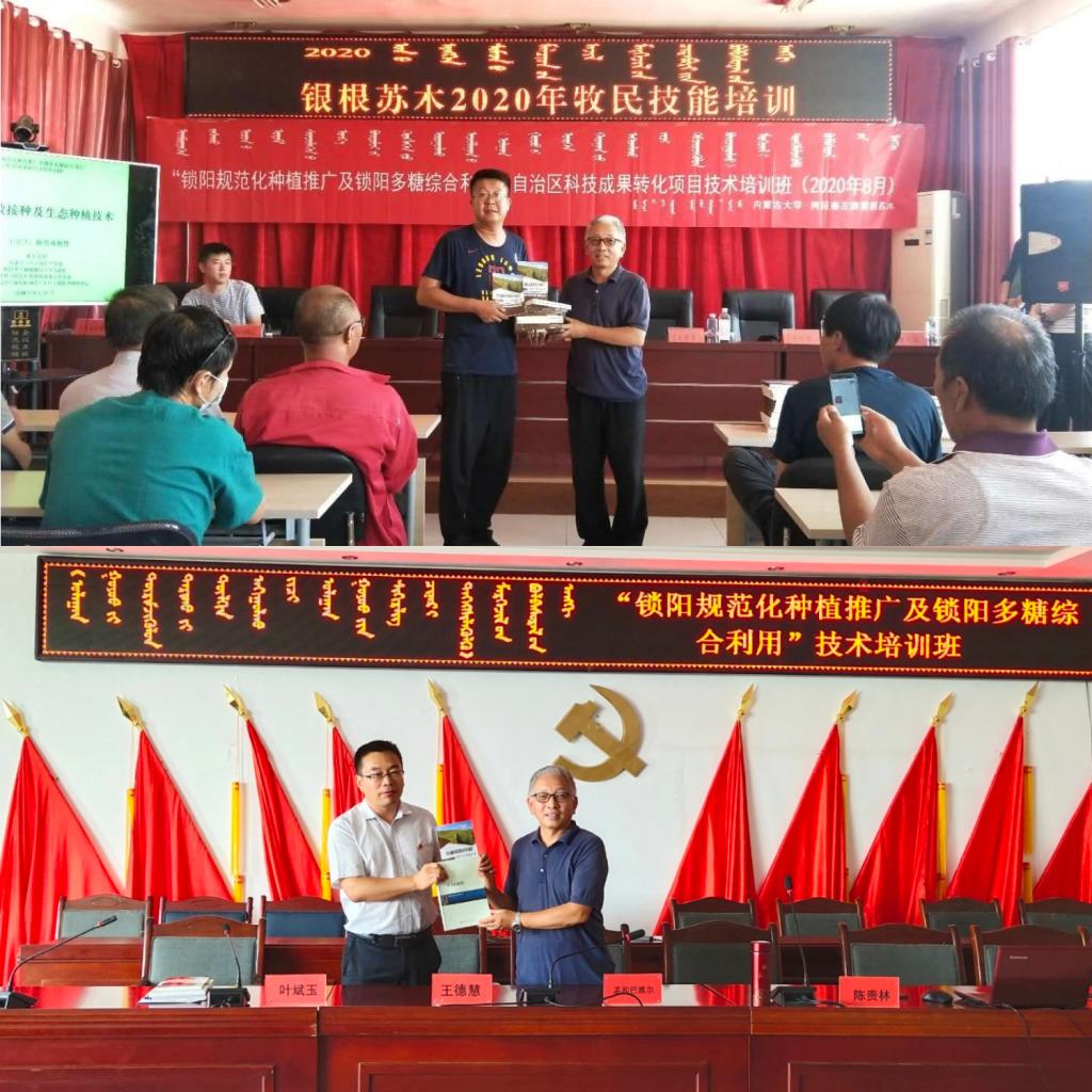 授课前陈贵林教授向阿拉善左旗银根苏木政府及阿拉善右旗塔木素人民政府分别捐赠了《30种常用中药材规范化种植技术》以及《中国锁阳》共180余本。