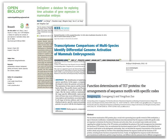 6月6日,我院2014级生物技术基地呼博苏同学在其本科学习阶段完成的关于哺乳动物早期胚胎发育全基因时序性激活的在线分析平台研究,论文题目为EmExplorer: a database for exploring time activation of gene expression in mammalian embryos的科研成果被英国皇家学会出版社下设Open Biology期刊(中科院JCR二区期刊,2018 IF: 3.890)在线发表。同年1月,2014级生物科学基地龙春申同学在本科阶段完成的关于哺乳动物植入前胚胎发育全基因组激活的物种特异性转录组比较的方法学论文,题目为Transcriptome comparisons of multi-species identify differential genome activation of mammals embryogenesis的科研成果被IEEE协会出版社下设IEEE access期刊(中科院JCR二区期刊,2018 IF: 4.098)在线发表。另外,2018年6月,2014级生物科学基地刘东阳同学在其本科学习阶段完成的关于TET蛋白发挥DNA去甲基化催化功能的序列基础研究成果,论文题目为Function determinants of TET proteins: the arrangements of sequence motifs with specific codes的科研成果被英国牛津大学出版集团下设的生物信息学领域权威期刊Briefings in Bioinformatics(中科院JCR一区TOP期刊,2018IF: 9.101)在线发表。