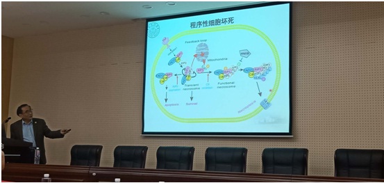 4月21日上午,韩家淮院士在生物楼229学术报告厅作题为“程序性细胞坏死的分子机制”的学术报告。我院200多名师生聆听了报告。本次学术报告由太阳集团tyc138院长莫日根教授主持。在报告中,韩教授全面系统总结了他开展的 “TNF诱导的细胞坏死分子机制”研究进展,从细胞凋亡开始,系统介绍了细胞程序性死亡的几种不同机制,详细阐述了他们所发现的p38核心信号通路及RIP3、MLKL在细胞坏死中的作用。