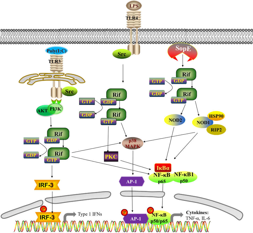 团队首次揭示了小G蛋白Rif对于模式识别受体介导的先天性免疫反应的调控机制。PAMPs代表病原体相关分子模式,实质是来自细菌或病毒的不同组分,能够被相应的PRRs即模式识别受体结合并引起机体的免疫反应。该研究发现LPS被TLR4识别后,通过Src 酪氨酸激酶磷酸化快速引起Rif的激活,并通过激活下游的PKCα来诱导NF-κB 活化和促炎因子的产生; 发现dsRNA通过TLR3-Src-Rif 轴诱导NF-κB依赖性的基因转录。此外,Rif激活还可以通过增强p38 MAPK介导的信号通路调控相关细胞因子基因的表达。应用Rif 基因敲除小鼠,进一步探索了内源性Rif在先天性免疫细胞中行使的功能。该研究成果以“Pattern recognition receptor mediated innate immune response requires a Rif-dependent pathway”为题发表在国际免疫学知名期刊Journal of Autoimmunity(中科院一区TOP)上。田晓霞博士为该文第一作者,范丽菲副教授和莫日根教授为本文通讯作者。