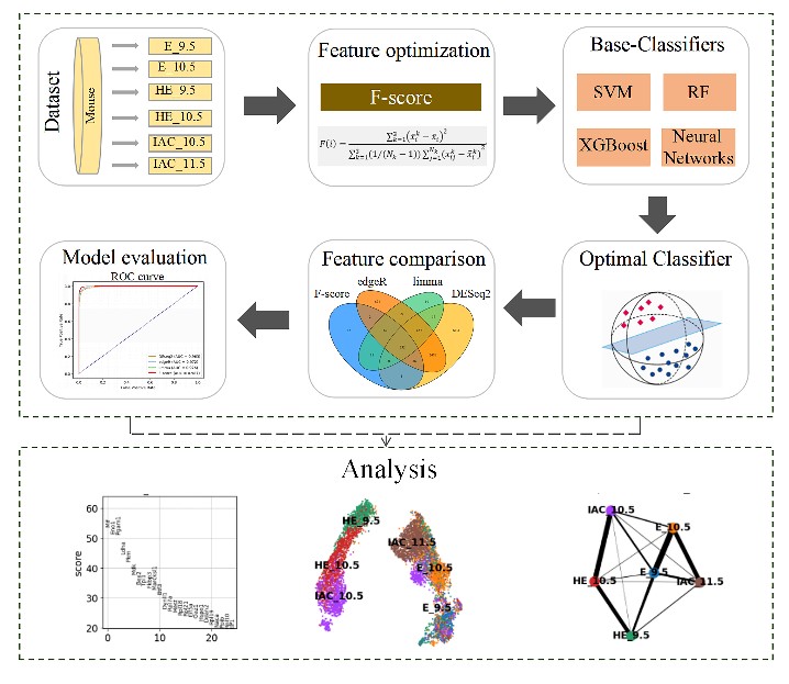 医学上根据HSC的特性将其称为“万用细胞”,因此能够系统全面地了解HSC的早期发育阶段对于体外获得血液研究以及再生医学具有重要的指导意义。基于上述目的,课题组将单细胞RNA测序数据和临床分子标记整合用于机器学习建模,设计并开发了HSC分化发育阶段预测器“eHSCpr”,它可以有助于更好地帮助临床医学人员理解HSC在发育过程中做出不同的分化方向和细胞命运决定。研究人员首先通过F-score算法与三种传统差异基因筛选方法(DESeq2、edgeR、limma)来得到不同的差异基因集,然后分别比较它们在人工智能算法中的建模表现。在多项评估指标下,F-score算法不依赖先验生物学知识的情况下,优于传统的差异基因筛选方法可以更精准的识别HSC发育阶段,而且发现了一些与早期HSC发育相关的新的关键信号基因,最后,我们建立了首个eHSCpr在线预测网站来方便相关科研工作者使用。