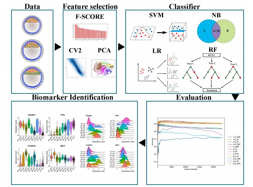 人类植入前胚胎在合子基因组激活 (ZGA) 后,细胞间的差异逐渐显现,导致全能卵裂球在胚胎第5天 (E5) 逐渐分化为内细胞团 (ICM) 和滋养外胚层 (PE)。ICM细胞显示特异转录因子 (TFs) 的“Salt and Pepper”表达,表明EPI和PE细胞逐渐变得不同。近年来,人工智能算法发展迅速并在精准医学领域得到广泛应用,尤其在识别候选发育相关调控因子和谱系决定分子事件方面具有显著优势。基于此,我们开发了第一个人类植入前胚胎谱系机器学习预测分析平台HelPredictor(http://bioinfor.imu.edu.cn/helpredictor),该平台集成了三种特征选择方法,即主成分分析 (PCA)、F-score算法和方差平方系数 (CV2),以及四种不同组合的经典人工智能算法,并通过增量特征选择算法来预测人类植入前胚胎谱系细胞。HelPredictor不仅通过交叉验证和独立测试分别达到94.9%和90.9%,而且使用该平台预测的因子能够分类不同的胚胎谱系及其发育轨迹,并对候选谱系特异性基因进行了详细讨论并进行了聚类,以探索胚胎异质性的转变。该工具可以快速有效地揭示潜在的谱系特异性和阶段依赖性生物标志物,并提供为发育生物学研究提供新的见解。