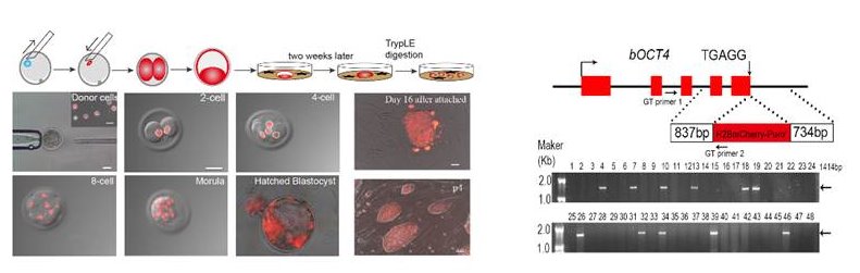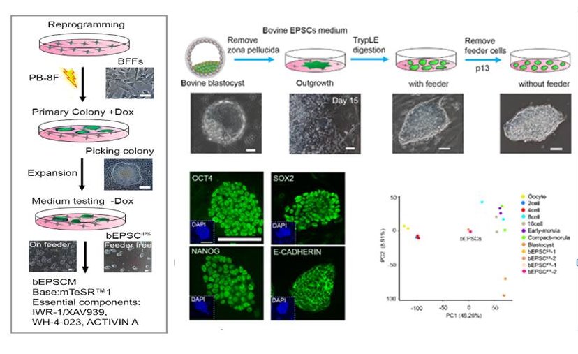 该研究通过TET-ON piggyBac系统重编程技术,采用项目合作单位联合设计的“8因子诱导组合”与自主研制的干细胞特定培养体系,经过前后五年、数百次的干细胞诱导关键技术探讨与干细胞培养关键因子检测试验,成功获得了由体细胞(bovine MEF)与早期胚胎细胞(bovine Blastocyst) 建立的两组多能性拓展的新型牛干细胞bEPSCips 与bEPSCES。通过体内、体外干细胞分化和嵌合实验证明这两种bEPSCs具有三胚层分化潜能, 其干细胞生物学定位在早期胚胎8-Cell~Morula阶段,与前期国内外同类研究相比充分显示了本研究获得的新型干细胞拓展多能性。