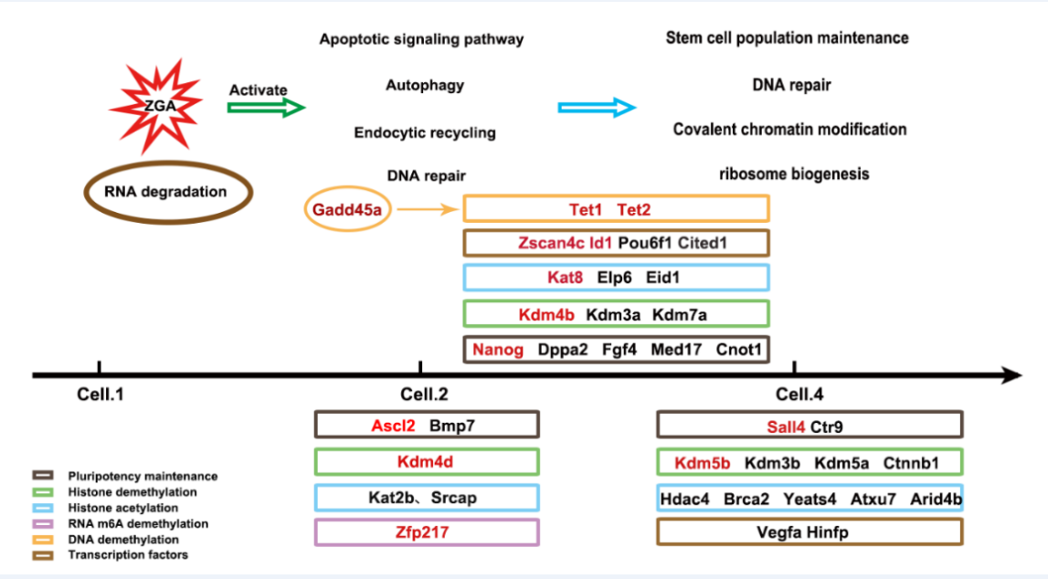 在另外一篇论文中“A Comparative Analysis of Single-Cell Transcriptome Identifies Reprogramming Driver Factors for Efficiency Improvement”, 左永春教授课题组针对克隆胚胎发育阻滞的关键分子标记识别问题,通过对单细胞转录组的比较分析发现,转录因子Id1、Pou6f1、Cited1、Zscan4c在NT正常胚胎中显著表达。与仅在NT 2细胞中激活的多能性基因Ascl2相比,Nanog、Dppa2和Sall4在NT 2细胞和4细胞胚胎的正常发育中都有主要的表达波发生。此外,进一步证实Kdm4b/4d和Kdm5b分别为NT 2细胞和4细胞胚胎的关键标志物。组蛋白乙酰化酶Kat8、Elp6和Eid1在NT 2细胞和4细胞胚胎中被共同激活,从而促进胚胎正常发育。另外Gadd45a作为一个关键的驱动因子通过与Tet1/2共同作用来提高NT重编程的效率。本研究为识别重编程驱动因子以提高SCNT重编程的效率提供了重要的理论基础。