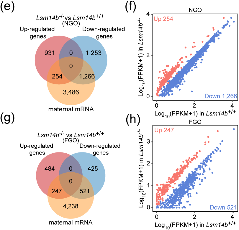 LSM14B作为RNA结合蛋白,它的缺失会影响mRNA的稳定性。因此,该研究团队探究了LSM14B对NGO和FGO中储存母源mRNA稳定性的影响。结果表明LSM14B的缺失不仅会影响母源mRNA的积累而且伴随着MARDO核心蛋白的降解,值得注意的是对NGO产生的影响显著大于FGO。