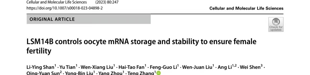 近日,太阳集团肉羊团队以Article形式在Cellular and Molecular Life Sciences(发表当年IF=9.2)上发表了题为“LSM14B controls oocyte mRNA storage and stability to ensure female fertility”的研究成果。该团队深入探究了在NGO中LSM14B对原始卵泡组装和母源mRNA储存的作用以及在FGO中决定卵母细胞质量的机制。