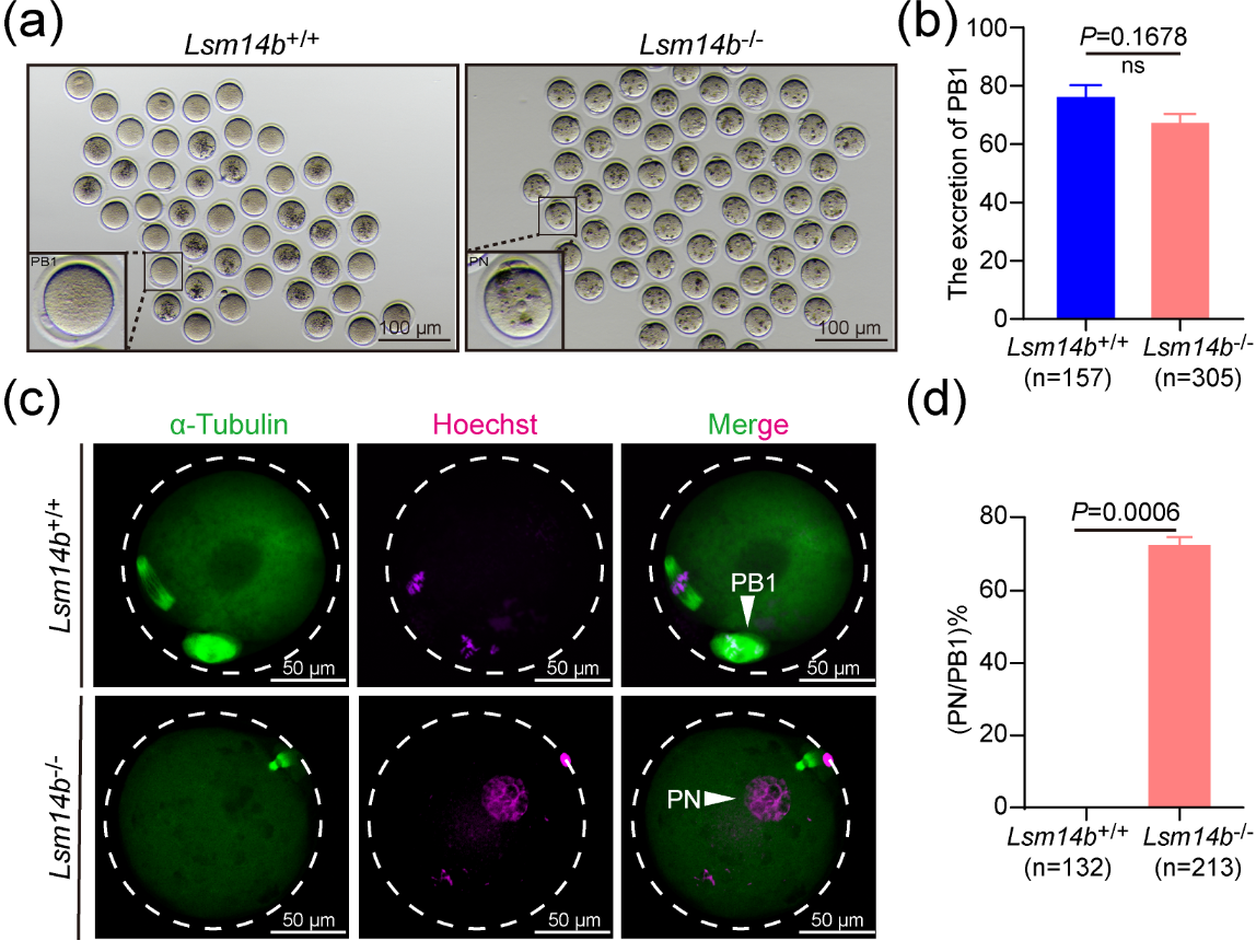 最后,敲除LSM14B的卵母细胞在排出第一极体后无法进入第二次减数分裂中期并重组了含有脱聚染色质的原核。该研究团队检测了成熟促进因子(maturation promoter factor, MPF)的活性,发现敲除LSM14B会破坏MPF的活性,同时利用WEE1/2抑制剂可挽救表型缺陷。