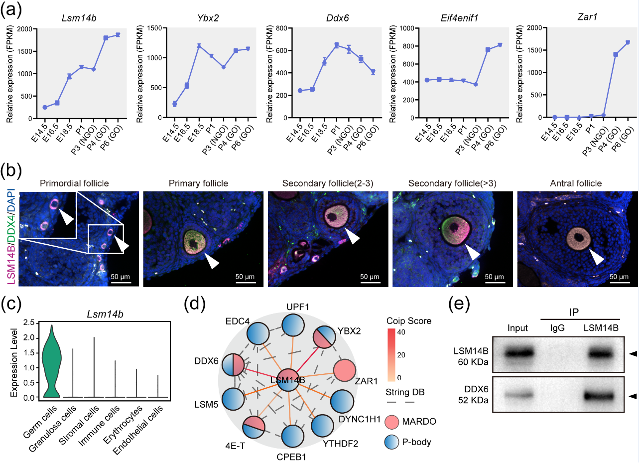 LSM14B是生殖细胞中P-body-like granules和MARDO无膜区室的共有蛋白之一。为进一步探究LSM14B对无膜隔室、原始卵泡库组装的作用,该团队利用10X单细胞测序、免疫沉淀、蛋白质谱测序的方法分析LSM14B-KO模型,发现LSM14B的敲除不仅会破坏原始卵泡组装还会影响mRNA的稳定性,同时伴随着P-body-like granules的组装受损。