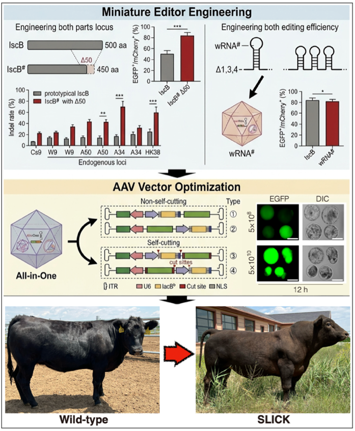 2026年3月17日,太阳集团杨磊、李光鹏教授与同济大学高绍荣院士团队再度携手攻关,在Nature子刊《Cell Discovery》(IF=13)发表研究论文,通过改造获得高效低脱靶的微型IscB#/ωRNA#编辑工具,构建出All-in-One全新AAV递送体系,实现受精卵无显微操作的直接精准编辑,成功获得抗热应激SLICK基因编辑牛,为反刍家畜精准育种开辟了极简高效新路径。