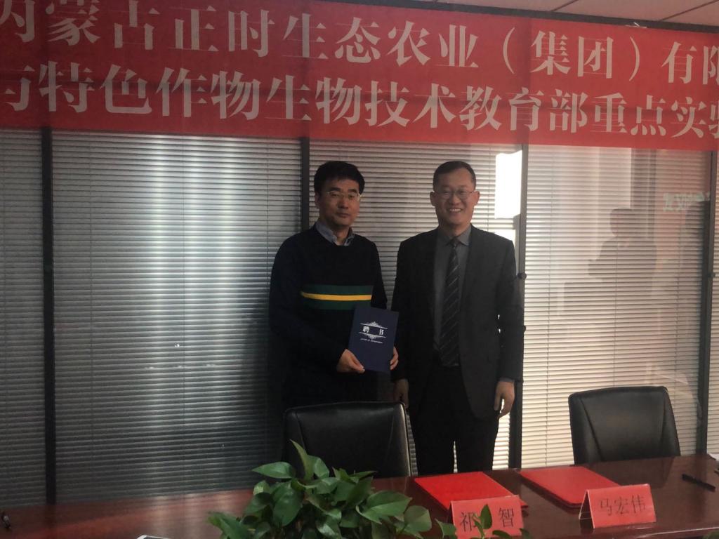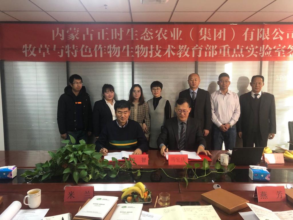仪式上,马宏伟总裁代表内蒙古正时生态农业(集团)有限公司讲话,介绍了公司的发展历程以及企业未来的发展战略,提出了公司在农牧业技术研发中存在的问题及其需求;祁智教授主要介绍了目前国际和国内草业、畜牧业和气候之间的研究进展及其关联性,重点介绍了牧草与特色作物生物技术教育部重点实验室的优势所在,能为企业带来的研发和技术支持项目。随后进行了座谈,主要是针对内蒙古正时生态农业(集团)有限公司技术总监刘丽平女生提出的苜蓿种植过程中的土壤质量分析,水肥控制、苜蓿品质检测等问题进行了深入交流。