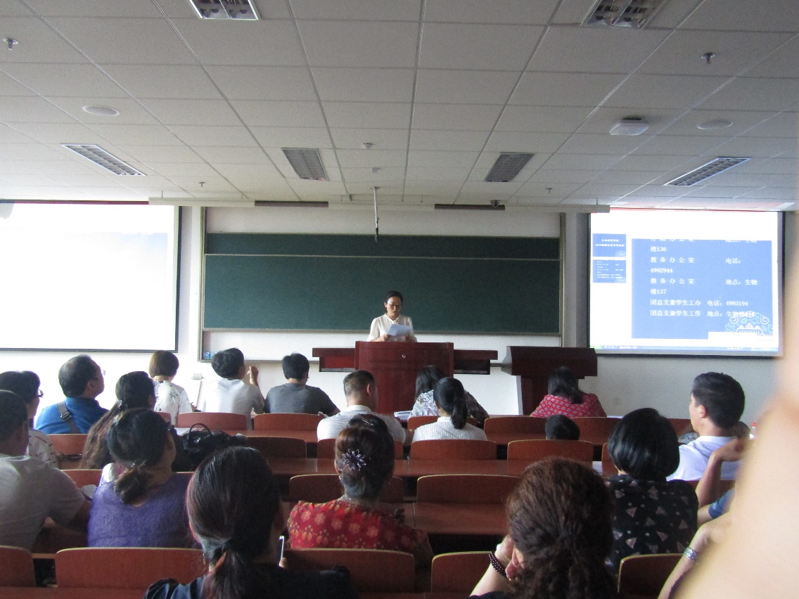 首先季老师就太阳集团tyc138三个办事处:行政办公室、教务办、团总支兼职学工办的职能为新生家长进行了详细讲解。从住宿规定、军训安排、学习成绩、校园安全等方面让新生家长对新生们即将展开的大学生活有了更加全面的了解。