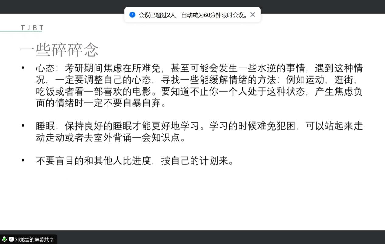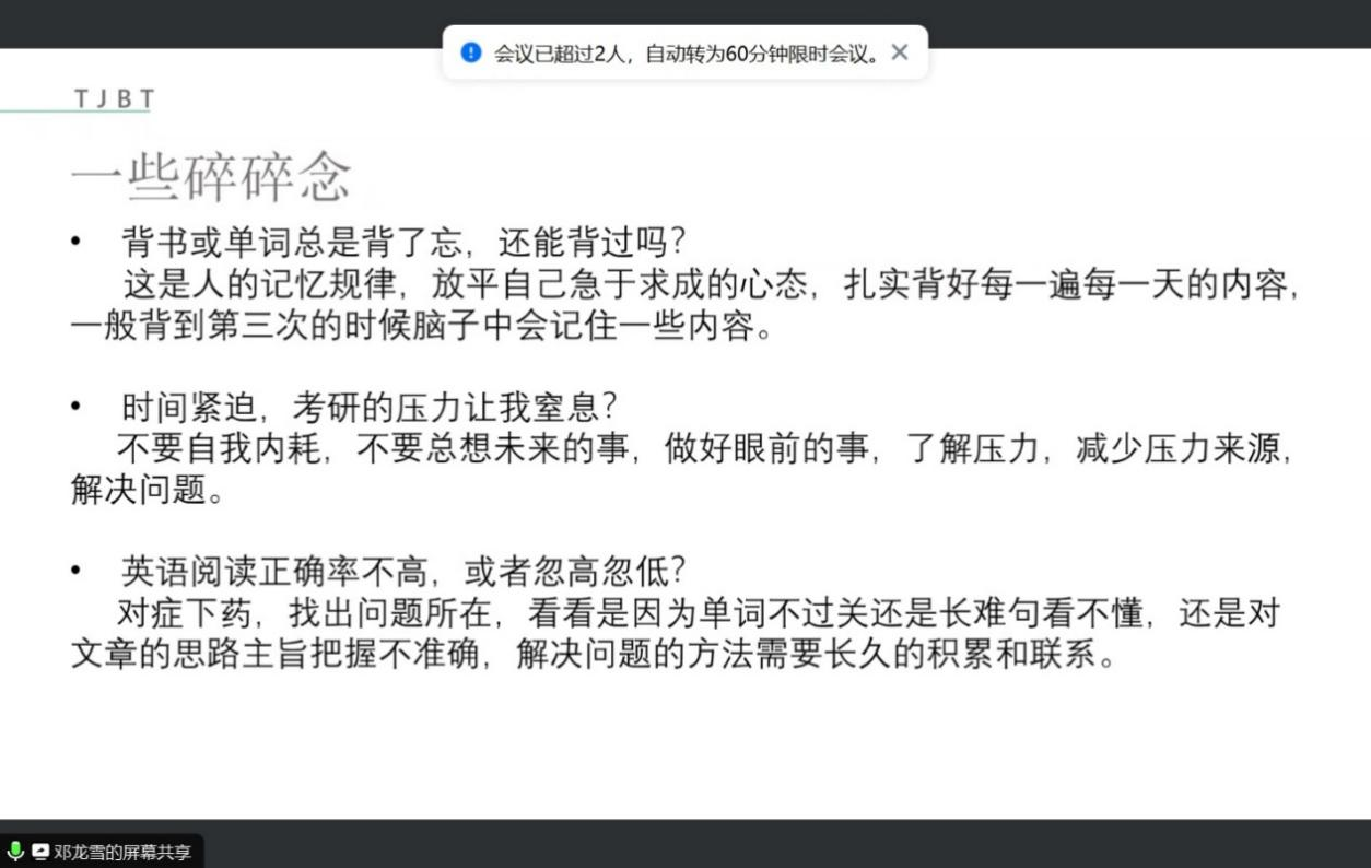 首先,左腾学长提出在考研阶段最重要的是坚定自己的信念、稳住自己的心态,相信自己一定能考上;然后提出几点考研期间的学习建议:1.腾出时间做一整套的真题,每一科目要有具体的目标;2.掌握基础知识,虽然题型增多但万变不离其宗;3.将知识形成框架,不死记硬背;最后对近几年的考研情况进行分析预测,左腾学长认为初试复试同样重要,同学们要做好充分准备。