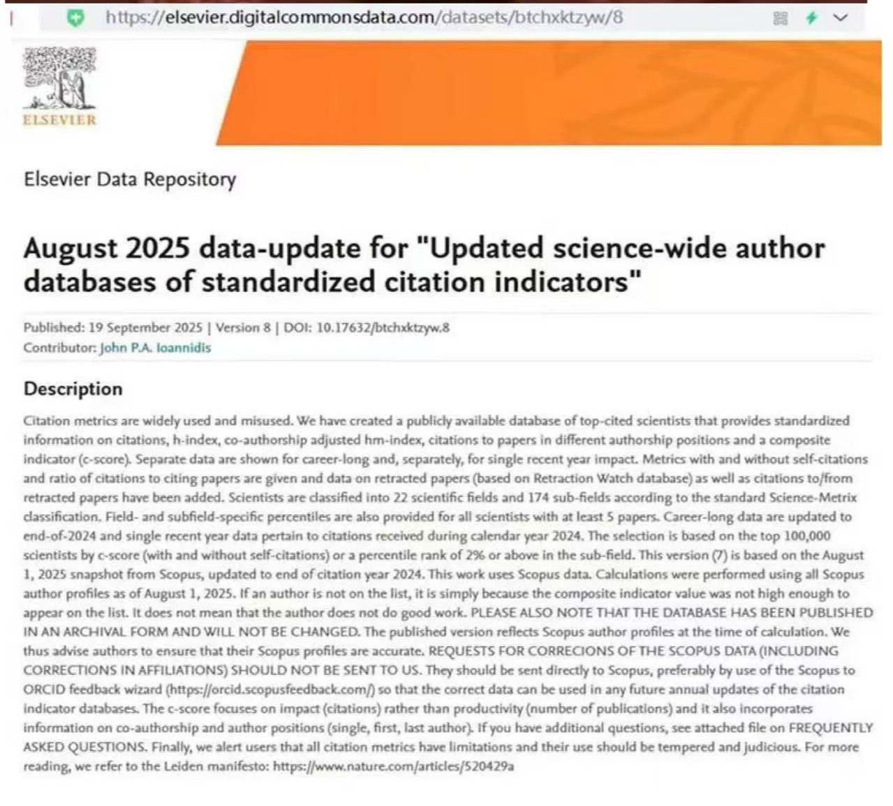 9月20日,美国斯坦福大学(Stanford University)与国际权威学术出版社爱思唯尔旗下的数据库(Elsevier Data Repository)联合发布了2025年度第八版《全球前2%顶尖科学家榜单》(World’s Top 2% Scientists)。我院马超美教授凭借深厚的理论积淀与卓越的研究产出成功入选 “生涯科学影响力” 和 “年度科学影响力” 榜单。