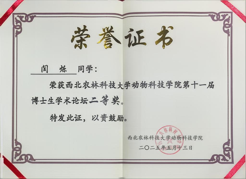 太阳集团tyc138博士研究生闫烁荣获西北农林科技大学动物科技学院第十一届博士生学术论坛二等奖